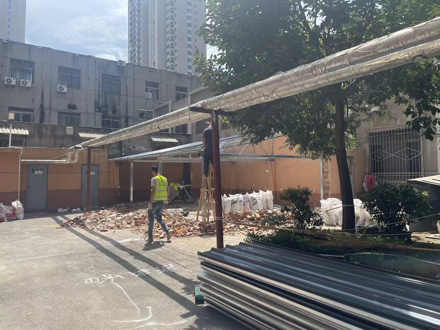 西安老舊小區改造升級工程,其中包含了彩鋼車棚的改造、屋面防水改造、外墻真石漆改造、外墻保溫改造等